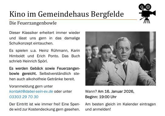 Filmabend | 16.01.2026 19:00 Uhr | Gemeinderaum Bergfelde | Wir zeigen den Film" Die Feuerzangenbowle" |